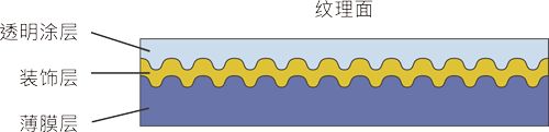 以本公司独特的加工技术,在薄膜透明涂层内部装饰上内嵌式纹理层。